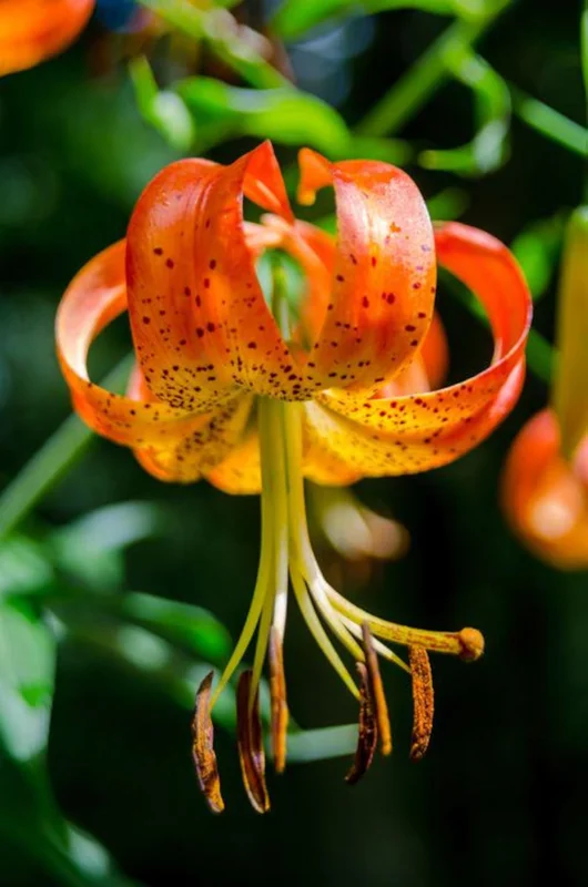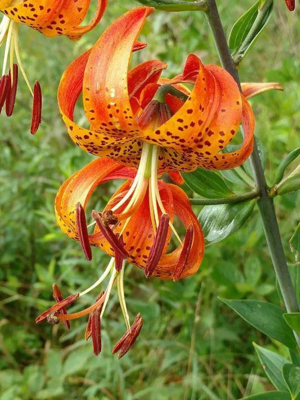The Turk’s Cap Lily blooms are not only beautiful but also accented by distinctive antler-like structures in brown to black hues, giving them an elegant, exotic look. These flowers attract attention and add a unique charm to any garden. The bulbs should be planted about 5 to 6 inches deep in well-drained soil, ideally under partial sun exposure. Growing Lilium Superbum is easy and rewarding.