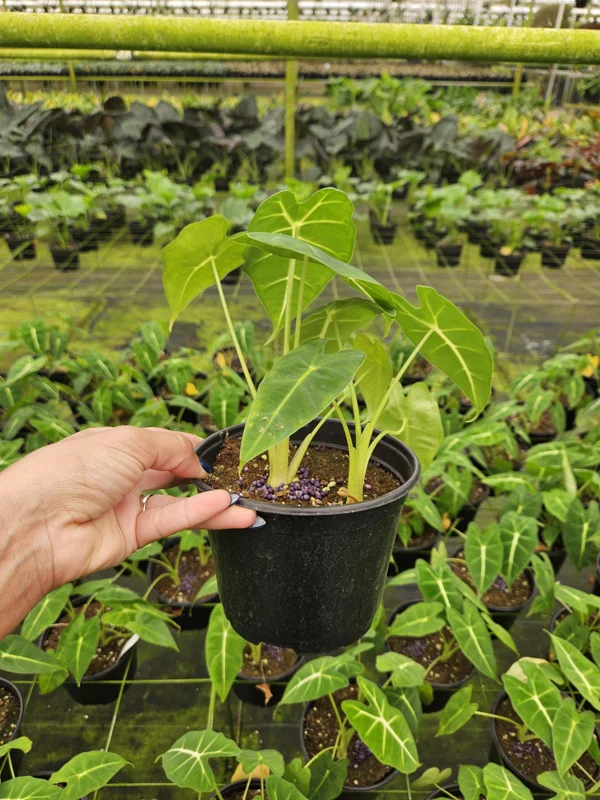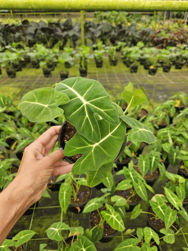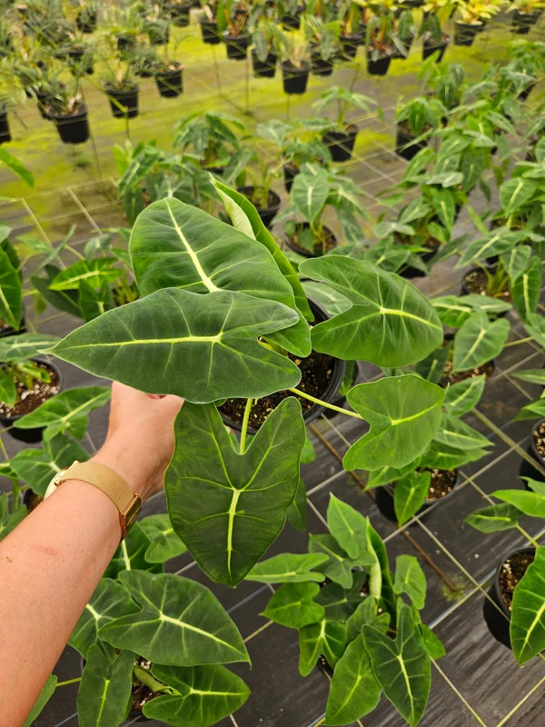The plant will arrive ready to be placed in your chosen decorative pot. With proper care, you can expect consistent new growth, especially during the warmer months. While it may take some time to reach its full mature size, the beauty of its developing velvety leaves and prominent venation is captivating at every stage. The Alocasia Frydek live plant prefers to be slightly root-bound, so frequent repotting is not necessary; usually, once every 1-2 years is sufficient when it outgrows its current pot.