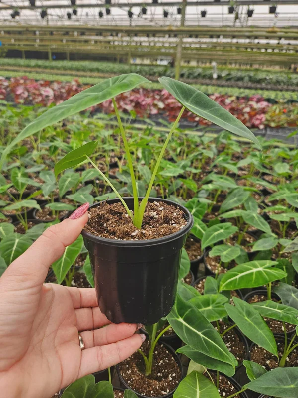 - Q: What size pot does the Alocasia Frydek come in? A: This Alocasia Frydek live plant is available in either a 4-inch or 6-inch nursery pot. You can choose the size that best suits your space and current plant collection needs.