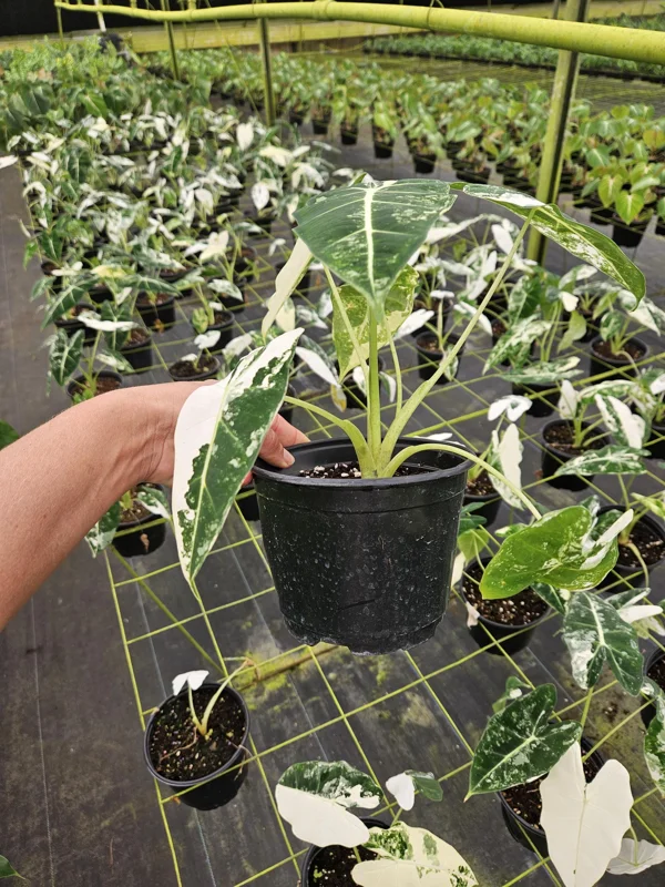 - Q: What size pot does the Alocasia Frydek Variegated live plant come in? A: You can choose your plant in either a 4-inch or a 6-inch nursery pot, providing a healthy start for your new tropical beauty.