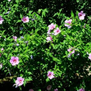The Aphrodite Rose of Sharon (Hibiscus syriacus) is a hardy, deciduous shrub that produces vibrant pink blooms with a deep red center throughout the summer and fall. This eye-catching plant is perfect for landscaping, hedges, and pollinator gardens, attracting bees, butterflies, and hummingbirds. Thriving in USDA Zones 6-9, this shrub is drought-tolerant and adapts well to various soil conditions.