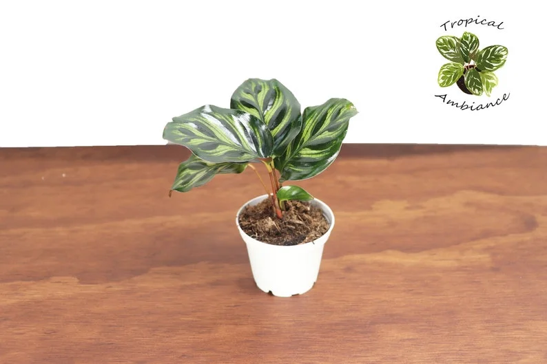 The Calathea Peacock Makoyana is a stunning addition to any indoor space. With its beautifully patterned leaves, reminiscent of a peacock’s feathers, this 2” plant brings a touch of the tropics right into your home. Its compact size makes it perfect for desks, shelves, or any small space needing a vibrant touch. The Calathea Makoyana is more than just a plant; it’s a living piece of art that enhances your living environment.