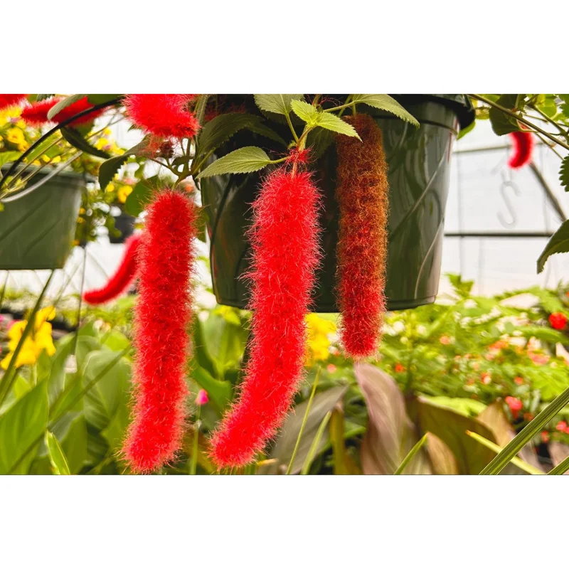 - Q: How big does this plant get? A: The Chenille Firetail Acalypha live plant is a dwarf variety, typically growing to a compact size of 4-8 inches tall as a starter plant. With maturity, it can spread 12-24 inches, with its cascading blooms extending further, making it ideal for hanging baskets.