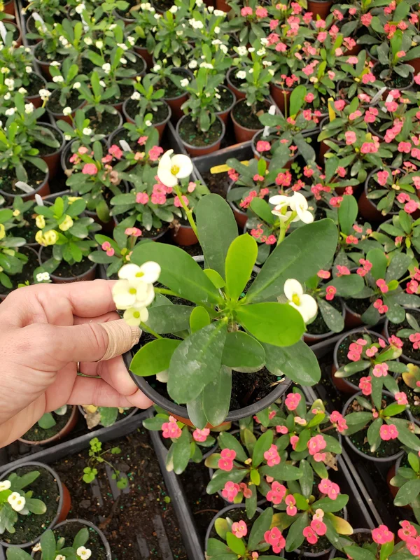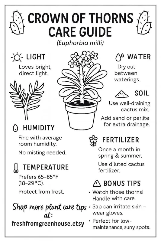 Temperature & Humidity: The Crown of Thorns thrives in warm temperatures, ideally between 65–85°F (18–29°C). It is not frost-tolerant and must be protected from temperatures below 45°F (7°C). If grown outdoors in colder climates, bring it indoors before the first frost. Average room humidity is perfectly fine; it does not require additional misting as it is a desert-adapted plant. This makes it an excellent easy care houseplant.