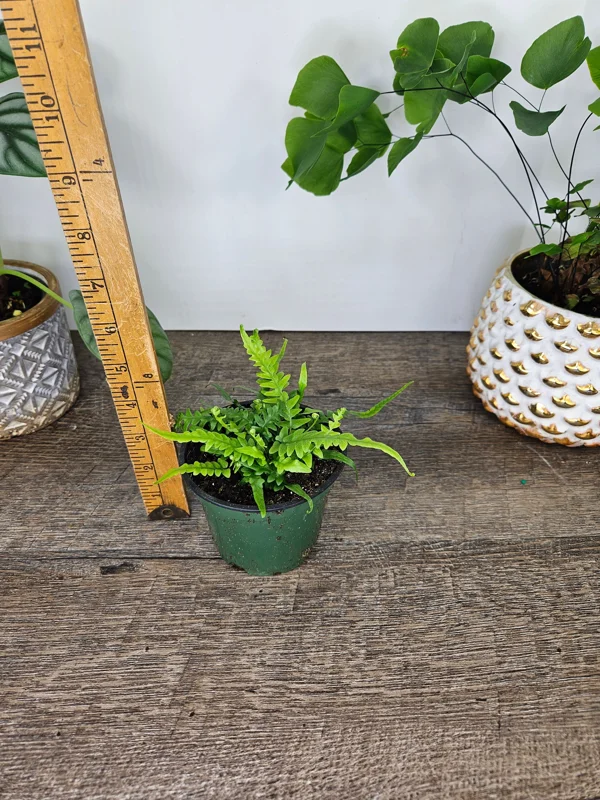 This offering is for one healthy Dragon’s Tail Fern live plant (Asplenium ebenoides) cultivated in a 4-inch nursery pot. The plant’s height typically ranges from 6 to 10 inches from the soil line at the time of shipment, with a spread of similar dimensions, though individual plants will vary given their unique growth patterns. The elongated fronds are the distinguishing characteristic, often reaching lengths of 4-8 inches. This fern is known for its moderate growth rate, gradually filling its pot with lush foliage over time. It is shipped as a fully rooted, established plant in its pot with soil, ensuring minimal transplant shock and a strong start in its new home. Expect this unique houseplant to continue growing, eventually reaching a mature height of 12-18 inches, making it a substantial yet manageable indoor specimen. The 4-inch pot size is ideal for immediate display on a desk, shelf, or as part of a larger plant arrangement.