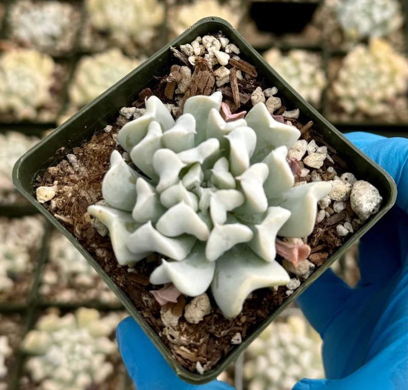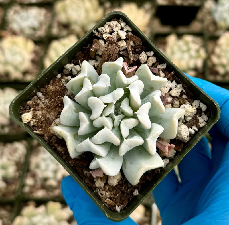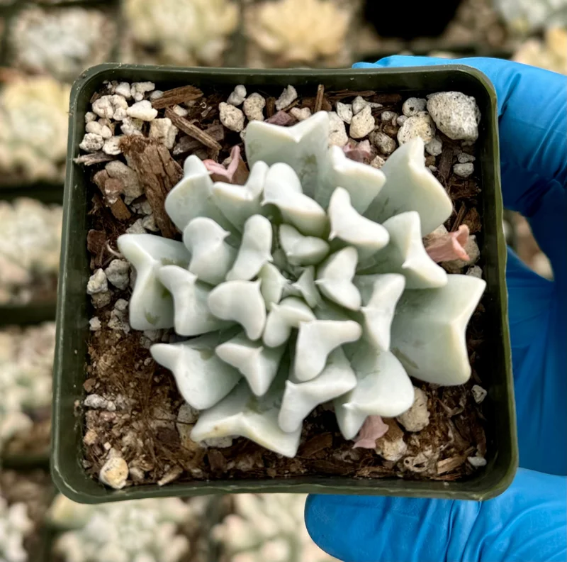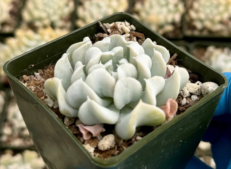 - Distinctive Appearance: Features uniquely twisted, spoon-shaped leaves arranged in a striking rosette, providing an eye-catching focal point in any plant display. The bluish-green color with a powdery farina coating adds to its visual allure.