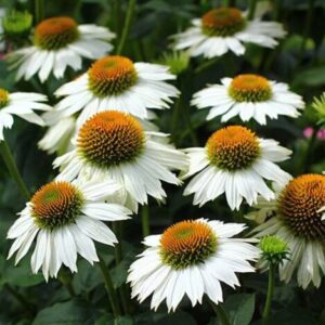 Echinacea ‘Pow Wow White’ is a hardy perennial known for its stunning white petals that surround a golden-yellow cone. This easy-to-grow coneflower blooms from late spring through late summer, providing long-lasting beauty in your garden. Drought-tolerant and low-maintenance, it thrives in full sun to light shade and prefers well-drained soil.