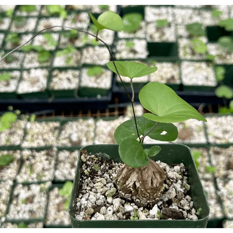 The elephant’s foot vine live plant you will receive is a healthy, actively growing specimen in a 3-inch pot. While the exact size of the caudex will vary slightly from plant to plant, it will be well-established and ready for continued growth. The plant will typically have developing vines and heart-shaped leaves, demonstrating its vibrant health. In its natural environment, the caudex can grow to several feet in diameter over many decades, and the vines can reach up to 20 feet (6 meters) in length. As an indoor ornamental, its growth will be more contained, but it will still steadily develop its unique caudex and produce elegant foliage.