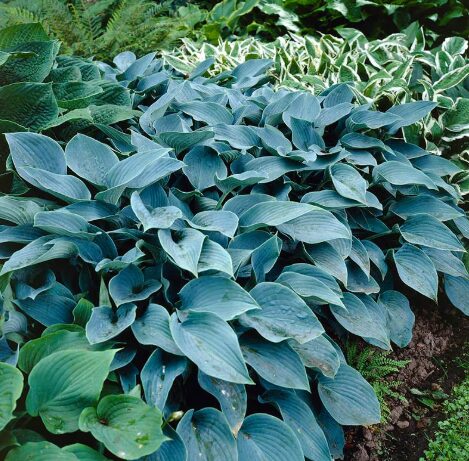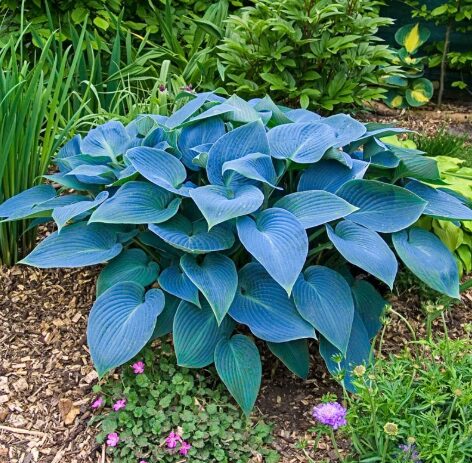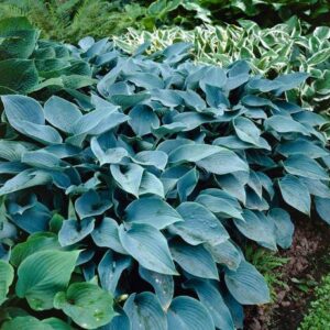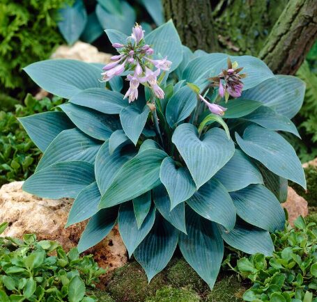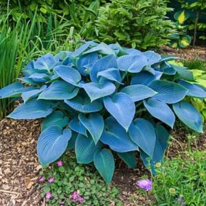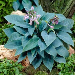 This hosta variety reaches 18 inches in height with a spread of up to 30 inches, creating a lush ground cover. It prefers partial to full shade and grows best in moist, well-drained soil. During midsummer, Halcyon Hosta produces delicate lavender flowers on tall scapes, attracting pollinators like bees and butterflies.