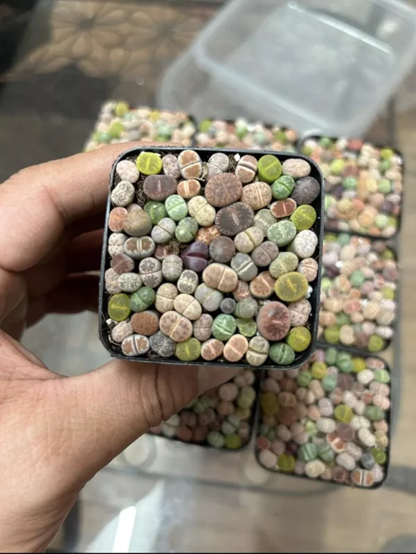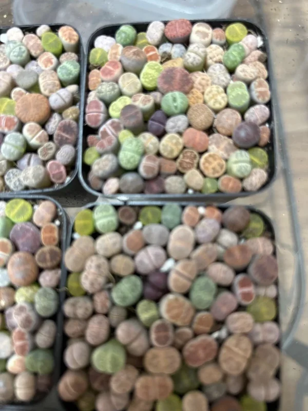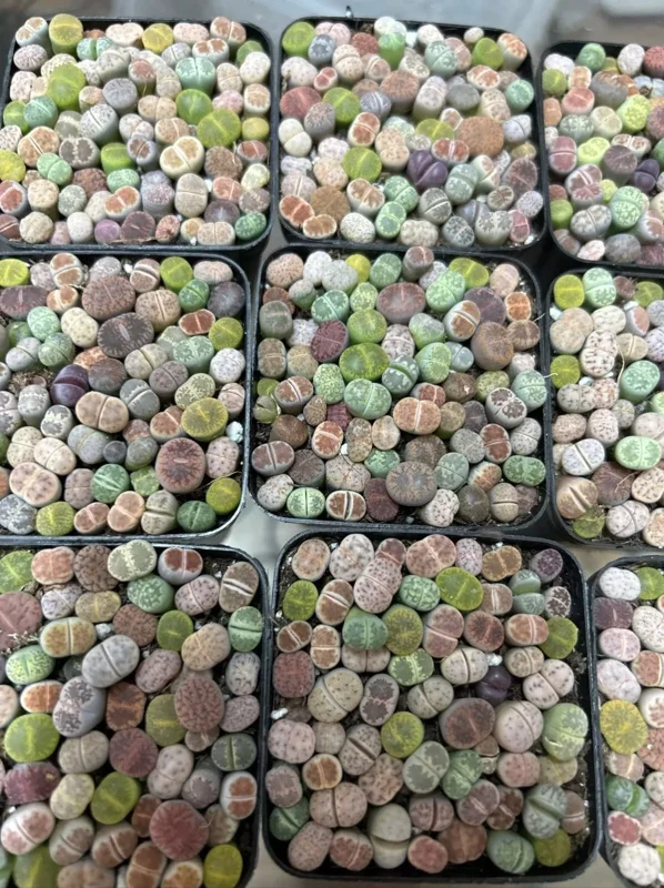 Each order includes a random selection of 50-60 Lithops seedlings in various colors and varieties, ensuring a vibrant and diverse collection. Your plants will be carefully shipped with soil and a pot, making transplanting a breeze. Although the plants may appear slightly faded upon arrival due to shipping conditions, rest assured that they will quickly regain their vibrant appearance once planted in well-draining soil and watered appropriately. These resilient small succulents are ready to thrive in their new home.