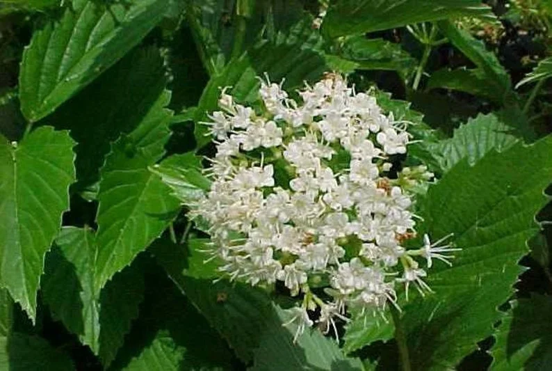 This variety, Viburnum dentatum ‘Chicago Lustre’, features thick, dark green leaves that maintain their vibrant color throughout the growing season. It produces creamy white flowers in late spring, followed by dark blue berries in fall that attract birds and wildlife. This drought-tolerant and deer-resistant shrub requires minimal care, making it perfect for gardens, borders, and urban landscapes.