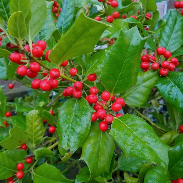 - Foliage & Color: Deep green leaves with vibrant red berries in winter