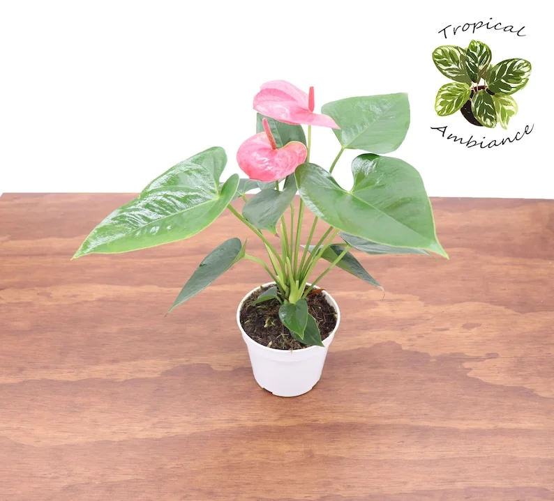 Enhance your living space with the vibrant beauty of a Pink Anthurium. This stunning 4-inch potted plant is perfect for adding a touch of the tropics to any room. The glossy, heart-shaped leaves and bright pink flowers of the Anthurium make it a captivating focal point. This Anthurium plant is easy to care for, making it an ideal choice for both beginner and experienced plant enthusiasts. Enjoy the long-lasting blooms and air-purifying benefits of this exquisite houseplant.