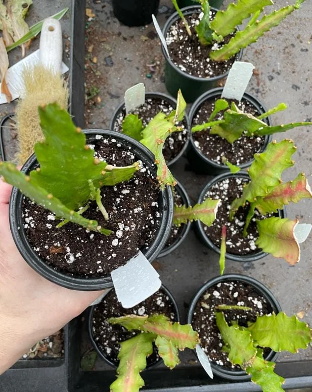 Epiphyllum species are known for their relatively fast growth rate under ideal conditions. When mature, the stems can trail or grow upright, making them suitable for various display settings. Expect your plants to begin producing their spectacular red blooms once they reach maturity and are provided with consistent care, typically in late winter to spring. The exact timing and abundance of flowers will depend on light, watering, and feeding. The compact size of the individual plants in their nursery pots makes them adaptable for diverse indoor spaces, from windowsills to hanging planters.