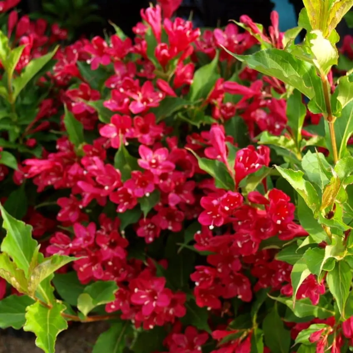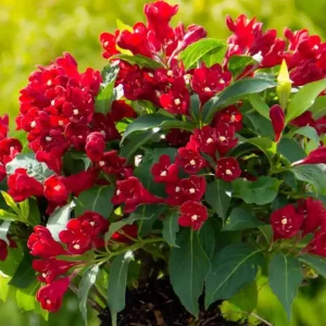 - Q: How much sunlight does a red flowering shrub need? A: For the best blooming performance, your Red Weigela should receive at least 6 hours of direct sunlight per day. It can tolerate partial shade, but flowering may be reduced, impacting the vibrancy of this red flowering shrub.