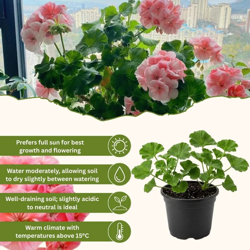 - Q: Is this plant easy to care for? A: Yes, geraniums are known for being very easy to grow and maintain, making them an excellent choice for beginners. Consistent watering and deadheading are the main requirements.