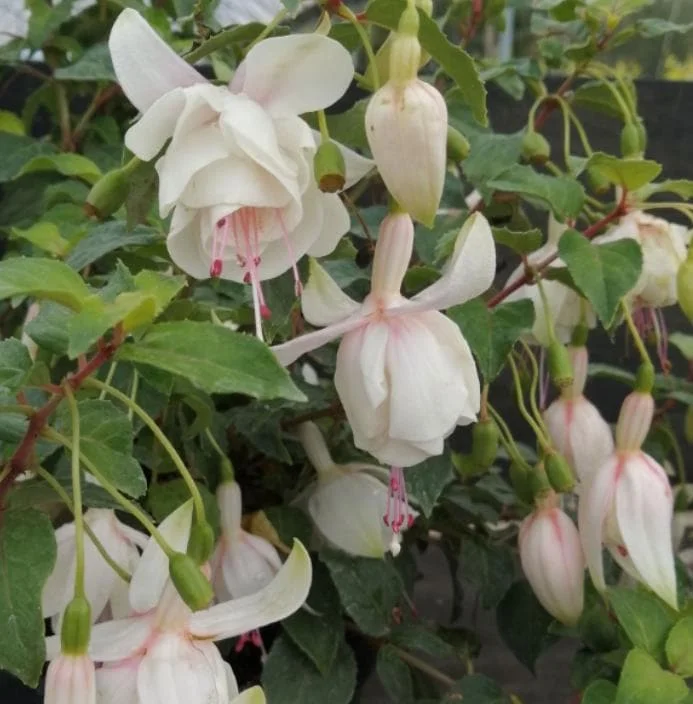 - Elegant Double White Blooms: The standout feature of this fuchsia is its gorgeous double white flowers. These intricate blossoms hang gracefully, creating a sophisticated and ethereal display that brightens shaded areas.