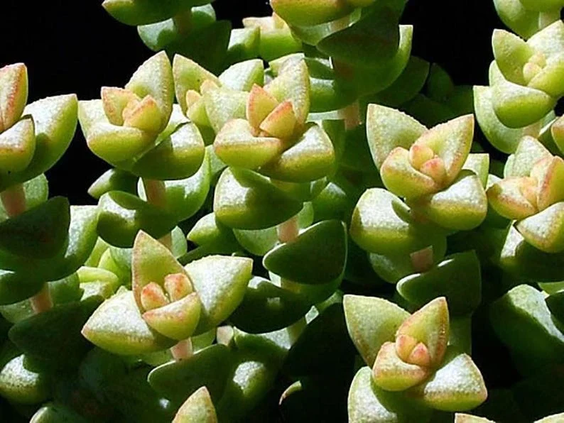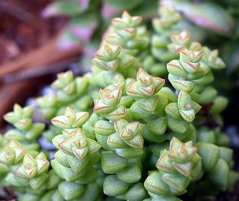 Enhance your space with Tom Thumb Jade (Crassula), a delightful miniature succulent ideal for both beginners and experienced plant lovers. Featuring mint-green triangular leaves arranged in opposite pairs and a delicate red outline when exposed to bright light, this Crassula variety brings a subtle pop of color to any environment. During spring, anticipate clusters of tiny, white star-shaped flowers, adding seasonal charm to your collection. The Tom Thumb Jade succulent is perfect for adding a touch of greenery to any indoor space.