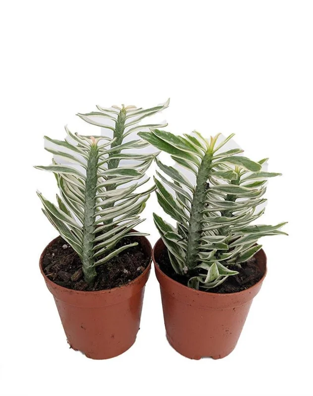 The White & Green Devil’s Backbone Plant (Pedilanthus) is a visually captivating succulent known for its unique zigzag stems and intriguing slipper-shaped flowers. This subtropical shrub is native to the tropical forests of Florida, Mexico, Central America, and South America. With its pink-tinted leaves in cooler weather, this Euphorbia family member adds visual interest to both indoor and outdoor spaces. This unique succulent is a perfect addition to your home or garden, adding a touch of exotic beauty.
